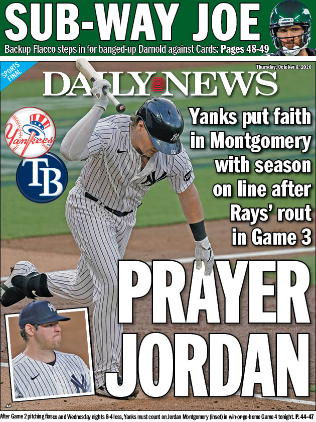 The Yankees' pitching plan blew up in their faces Tuesday night. Using two of their better starters — Deivi Garcia as an "opener" and J.A. Happ as their "bulk" guy — opened the door to the Rays . . . That forced the Yankees to have to go into Thursday's game facing elimination . . . with their least consistent starter on the mound.